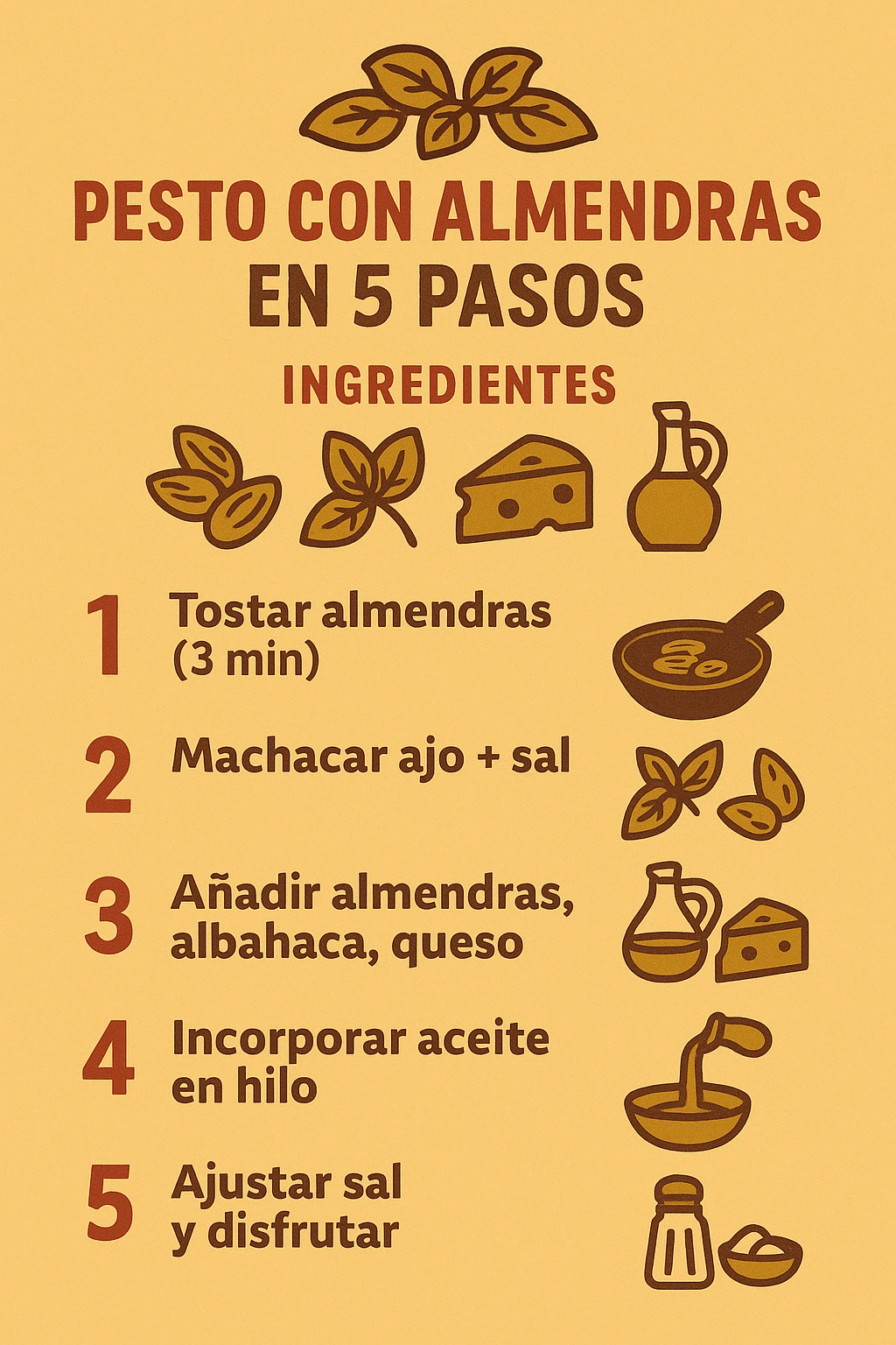 Cuentan las crónicas que el primer pesto llevaba ajo, albahaca, aceite y algún fruto seco al alcance. Con los años, cada nonna añadió su toque: más queso, menos ajo, un chorrito de limoncillo… Nosotros respetaremos la tradición, pero con la suavidad y el dulzor que solo la almendra brinda.